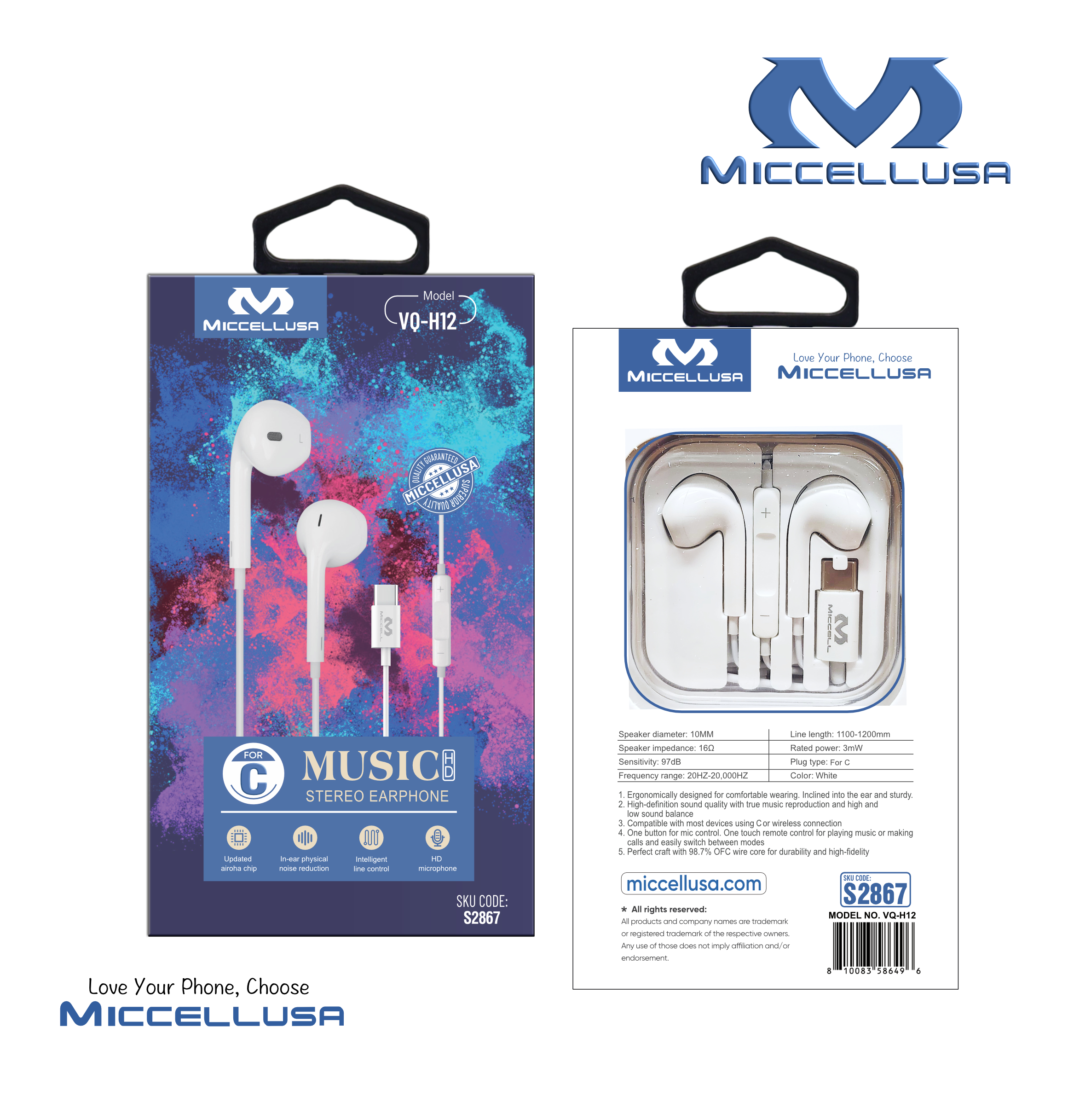 S2867 MiccellUSA Music Stereo C-Type Wired Earphone (VQ-H12) BOX Pack